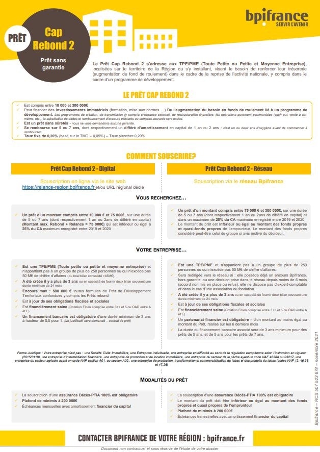 Le Prêt Relance Région s'adresse aux TPE/PME localisée sur le territoire de la Région ou s'y installant, visant le besoin de renforcer leur trésorerie dans le cadre de la reprise de l'activité nationale.